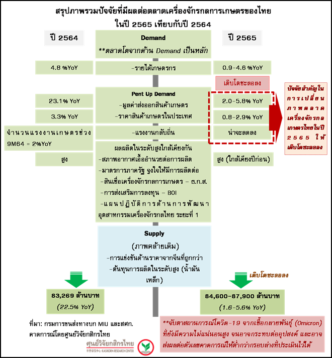 -แรงงานกลับถิ่นที่น่าจะมีจำนวนน้อยลงเมื่อเทียบกับปีก่อนจากการฟื้นตัวของกิจกรรมทางเศรษฐกิจ อีกทั้งยังขึ้นอยู่กับกำลังซื้อของแต่ละบุคคล โดยเกษตรกรบางส่วนอาจมีการลงทุนซื้อไปแล้วในปีก่อน และยังขึ้นอยู่กับการประเมินความคุ้มค่าที่จะลงทุนซื้อเครื่องจักรใหม่ ล้วนส่งผลต่ออุปสงค์ให้อาจชะลอลง
