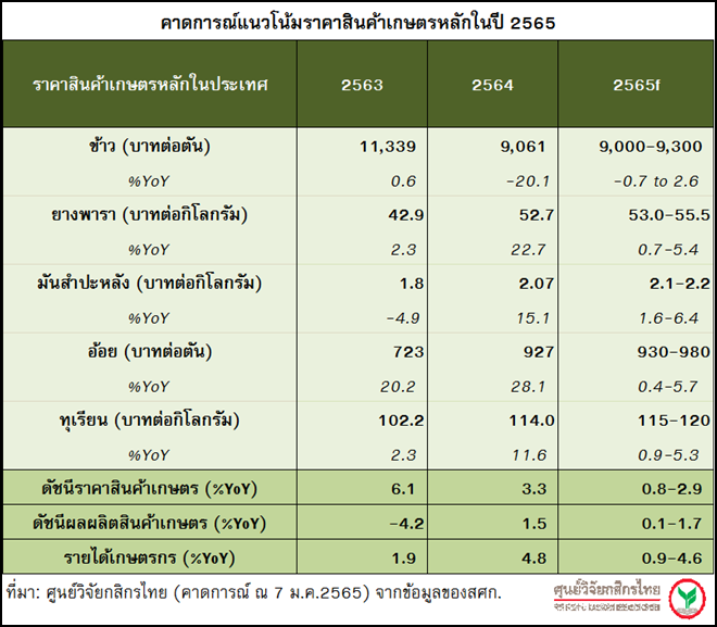 -Pent Up Demand ที่คลี่คลายมากขึ้น สะท้อนผ่านมูลค่าการส่งออกสินค้าเกษตรของไทยที่น่าจะขยายตัวชะลอลงมาอยู่ที่ร้อยละ 2.0-5.8 (YoY) และราคาสินค้าเกษตรในประเทศที่อาจขยายตัวชะลอลงมาอยู่ที่ร้อยละ 0.8-2.9 (YoY)