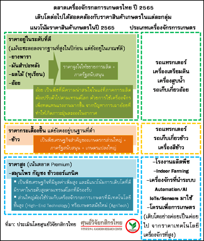 ทั้งนี้ ศูนย์วิจัยกสิกรไทย มองว่า ในปี 2565 ตลาดเครื่องจักรกลการเกษตรน่าจะเติบโตต่อไปได้สอดคล้องกับอุปสงค์ในสินค้าเกษตรที่มีราคาอยู่ในเกณฑ์ดี เช่น ยางพารา มันสำปะหลัง ผลไม้ (ทุเรียน) และอ้อย (เทรนด์โลกที่เป็นมิตรกับสิ่งแวดล้อมมากขึ้น จะทำให้เกษตรกรผู้ปลูกอ้อยต้องปรับตัวด้วยการหันมาใช้เครื่องจักรทดแทนแรงงานมากขึ้น เช่น เครื่องเก็บเกี่ยวอ้อย เพื่อลดการเผาอ้อยที่จะก่อให้เกิดภาวะฝุ่น/มลพิษทางอากาศ) ขณะที่สินค้าเกษตรที่แม้จะมีราคาไม่สูงนัก แต่อาจกระเตื้องขึ้นได้และมีความสำคัญต่อเกษตรกรจำนวนมากอย่างข้าว นับว่าจะยังเป็นสินค้าเกษตรที่ช่วยหนุนอุปสงค์เครื่องจักรกลการเกษตรของไทยโดยเฉพาะรถแทรกเตอร์และเครื่องเก็บเกี่ยวข้าว นอกจากนี้ จากเทรนด์โลกที่หันมารักสุขภาพมากขึ้น จะช่วยหนุนให้พืชเกษตรอย่างสมุนไพร กัญชง ข้าวออร์แกนิค ให้มีราคาอยู่ในระดับสูง ประกอบกับความต้องการใช้เครื่องจักรกลการเกษตรที่มีเทคโนโลยีขั้นสูง เพื่อลดข้อจำกัดด้านการเปลี่ยนแปลงสภาพภูมิอากาศ จะช่วยหนุนให้เครื่องจักรกลการเกษตรอย่างโรงงานผลิตพืช การปลูกพืชในระบบปิด โดรนเพื่อการเกษตร เครื่องจักรที่นำระบบ Automation/AI/IoTs/Sensors เข้ามาใช้ จะมีบทบาทในภาคเกษตรมากขึ้นในระยะข้างหน้า
