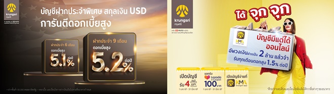 กรุงศรี (ธนาคารกรุงศรีอยุธยา จำกัด (มหาชน)) ส่งสองผลิตภัณฑ์เงินฝาก เพิ่มทางเลือกการออมและโอกาสรับผลตอบแทนที่มากขึ้น ประกอบด้วย “เงินฝากประจำพิเศษ สกุลเงิน USD” แบบระยะเวลาฝาก 6 เดือน และ 9 เดือน รับดอกเบี้ยสูงสุด 5.2% ต่อปี และบัญชีเงินฝาก “กรุงศรี มีแต่ได้ ออนไลน์” ที่ปรับขยายเพดานเงินฝากสูงขึ้นเป็น 2 ล้านบาท รับดอกเบี้ยสูง 1.5% ต่อปี