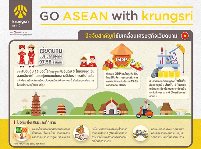 “เพื่ออยู่เคียงข้างเป็นพันธมิตรที่ดีให้กับลูกค้า กรุงศรีมีทีมที่มีความรู้และประสบการณ์ในการให้ช่วยเหลือลูกค้าขยายธุรกิจไปต่างประเทศ โดยทีมนี้จะทำงานร่วมกับ MUFG และธนาคารพันธมิตรในประเทศต่างๆ ซึ่งสำหรับลูกค้าที่สนใจและต้องการขยายธุรกิจไปยังประเทศเวียดนาม กรุงศรีพร้อมดูแลเริ่มตั้งแต่การให้คำปรึกษา วิเคราะห์ และสนับสนุนข้อมูลด้านการตลาด ข้อมูลทางเศรษฐกิจเพื่อการควบรวมกิจการและการขยายการลงทุนในต่างประเทศ ซึ่งอาจจะนำไปสู่การพัฒนาและจัดตั้งสำนักงานธุรกิจในระดับภูมิภาค รวมไปถึงการให้คำปรึกษาด้านกฎระเบียบทางธุรกิจ ซึ่งเป็นเรื่องที่แตกต่างกันไปในแต่ละประเทศ ตลอดจนการให้คำแนะนำโซลูชันด้านผลิตภัณฑ์ทางการเงินต่างๆอย่างครบวงจร ที่พร้อมนำพาโอกาสใหม่ๆ ในการขยายธุรกิจและสร้างการเติบโตให้กับลูกค้าของกรุงศรีในตลาดเวียดนามได้อย่างแน่นอน ตามแนวทาง GO ASEAN with krungsri” นายวันชัยระบิน กล่าวปิดท้าย