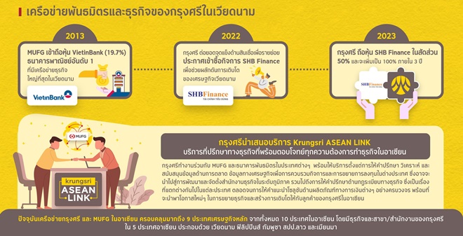 “นอกจาก SHB Finance จะเป็นฟันเฟืองสำคัญในการขยายฐานลูกค้ารายย่อยในต่างประเทศแล้วนั้น กรุงศรี ซึ่งเป็นสถาบันการเงินในกลุ่ม MUFG ยังมีความได้เปรียบในเรื่องเครือข่ายที่แข็งแกร่ง โดยสามารถใช้ความรู้ ความเชี่ยวชาญระดับโลก และโอกาสจากเครือข่ายธนาคารพันธมิตรอย่าง VietinBank ธนาคารพาณิชย์ชั้นนำในเวียดนามซึ่ง MUFG เป็นผู้ถือหุ้น ในการผสานความช่วยเหลือและเพิ่มโอกาสให้กับลูกค้าไทยที่ต้องขยายธุรกิจไปในเวียดนาม ซึ่งจากโจทย์ความต้องการของลูกค้าที่ต้องการเป็นที่ปรึกษาหรือพันธมิตรในการให้ความช่วยเหลือหรือสนับสนุนในด้านต่างๆ เมื่อเร็วๆ นี้ธนาคารได้ยกระดับบริการที่ปรึกษาทางธุรกิจให้แข็งแกร่งและมีประสิทธิภาพมากขึ้น ภายใต้ชื่อ Krungsri ASEAN LINK ที่พร้อมตอบโจทย์ทุกความต้องการในการทำธุรกิจ”