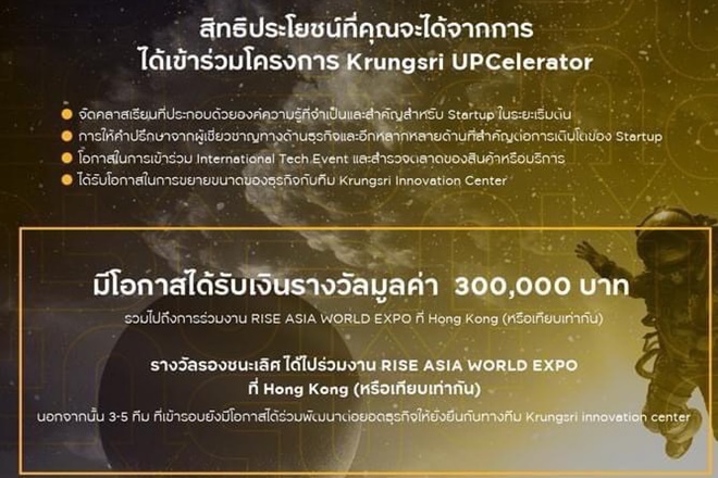 ‘สำหรับ Krungsri UPcelerator ปีแรกนี้นั้นกลุ่มผลงานที่โฟกัสในการให้เข้าร่วมประกวด จะโฟกัสกลุ่มธุรกิจที่คำนึงถึง ESG เป็นหลัก โดยจะเน้นธุรกิจที่สอดคล้องกับการส่งเสริมเศรษฐกิจและอุตสาหกรรมด้าน ESG Tech, Smart City, HealthTech, AI Robotics, FinTech, TravelTech และ Aging Society’ ซึ่งสตาร์ทอัพในด้านดังกล่าวที่สนใจ สามารถเข้าไปดูข้อมูลเพิ่มเติมได้ที่เฟซบุ๊คเพจ Krungsri Finnovate หรือ https://fb.me/e/3NgikDBdX