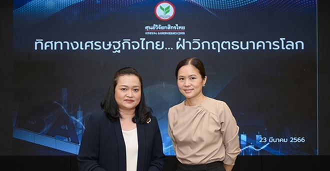นางสาวณัฐพร ตรีรัตน์ศิริกุล รองกรรมการผู้จัดการ บริษัท ศูนย์วิจัยกสิกรไทย จำกัดกล่าวเพิ่มเติมว่า สำหรับผลกระทบต่อเศรษฐกิจสหรัฐฯ นั้น คาดการณ์ว่าปัญหาภาคธนาคาร จะส่งผลให้เศรษฐกิจสหรัฐฯ ชะลอตัวลงมากกว่าเดิม และมีแนวโน้มสูงขึ้นที่จะเข้าสู่ภาวะถดถอยบางไตรมาสในช่วงครึ่งหลังของปี ซึ่งภาพความกังวลข้างต้น สะท้อนผ่านโมเมนตัมการปรับดอกเบี้ยนโยบายของเฟดในการประชุมครั้งล่าสุด (วันที่ 21-22 มีนาคม) ที่ผ่อนคันเร่งลงด้วยการปรับขึ้นอัตราดอกเบี้ยนโยบาย 0.25% จากช่วงก่อนเกิดปัญหาภาคธนาคารสหรัฐฯ ที่ตลาดมองว่าจะมีการปรับขึ้นอัตราดอกเบี้ยนโยบายถึง 0.50% ทั้งนี้ เศรษฐกิจสหรัฐฯ ที่มีแนวโน้มชะลอลงมากกว่าเดิมน่าจะมีผลกระทบต่อไทยผ่านช่องทางการค้า โดยเฉพาะภาคการส่งออก ขณะที่ แรงกดดันเงินเฟ้อของไทยทยอยปรับตัวลดลง ตามทิศทางราคาพลังงานที่ลดลงตามการชะลอตัวของกิจกรรมทางเศรษฐกิจโลก ศูนย์วิจัยกสิกรไทยจึงปรับลดประมาณการเงินเฟ้อทั่วไปในปี 2566 ลงมาที่ 2.8% จากเดิมที่ 3.2%