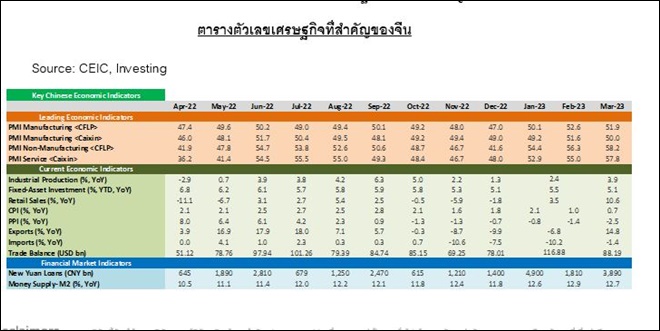 แม้ว่าเศรษฐกิจจีนไตรมาสแรกของปี 2566 จะออกมาเติบโตมากกว่าตลาดคาดการณ์ แต่อัตราการเติบโตยังคงต่ำกว่าเป้าหมายของภาครัฐที่ 5% จึงคาดว่าในช่วงที่เหลือของปีทางการจะมีมาตรการกระตุ้นเศรษฐกิจทางส่วนของการเงินและการคลังเข้ามาเพิ่มเติมเพื่อผลักดันให้การบริโภคภายในประเทศเติบโตได้ต่อเนื่องเพื่อชดเชยการชะลอลงของภาคการส่งออกและภาคอสังหาริมทรัพย์ รวมถึงให้เป็นไปตามเป้าหมายการเติบโตอย่างมีคุณภาพโดยเน้นการพึ่งพาภายในประเทศเป็นหลักของจีน ศูนย์วิจัยกสิกรไทยคาดการณ์ว่าจีนจะสามารถเติบโตได้เกินกว่าเป้าหมายของภาครัฐโดยจะขยายตัวอยู่ที่ 5.2%