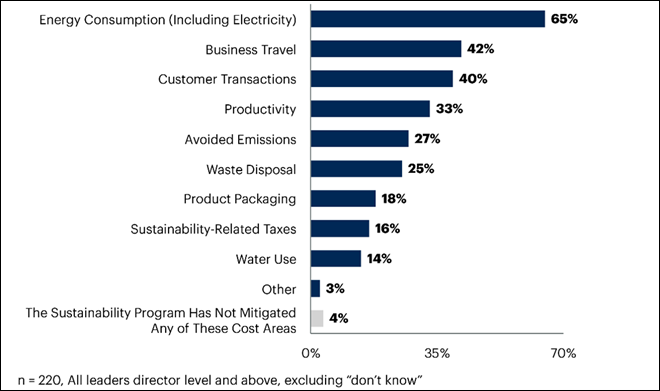 โดยเฉพาะอย่างยิ่ง ผู้ตอบแบบสำรวจระบุว่าโครงการความยั่งยืนกำลังช่วยลดต้นทุนให้กับประเด็นต่อไปนี้เป็นอันดับต้น ๆ ซึ่งประกอบด้วย การใช้พลังงาน (Energy Consumption) การเดินทางเพื่อธุรกิจ (Business Travel) และธุรกรรมของลูกค้า (Customer Transaction) (ตามรูปภาพที่ 1)
