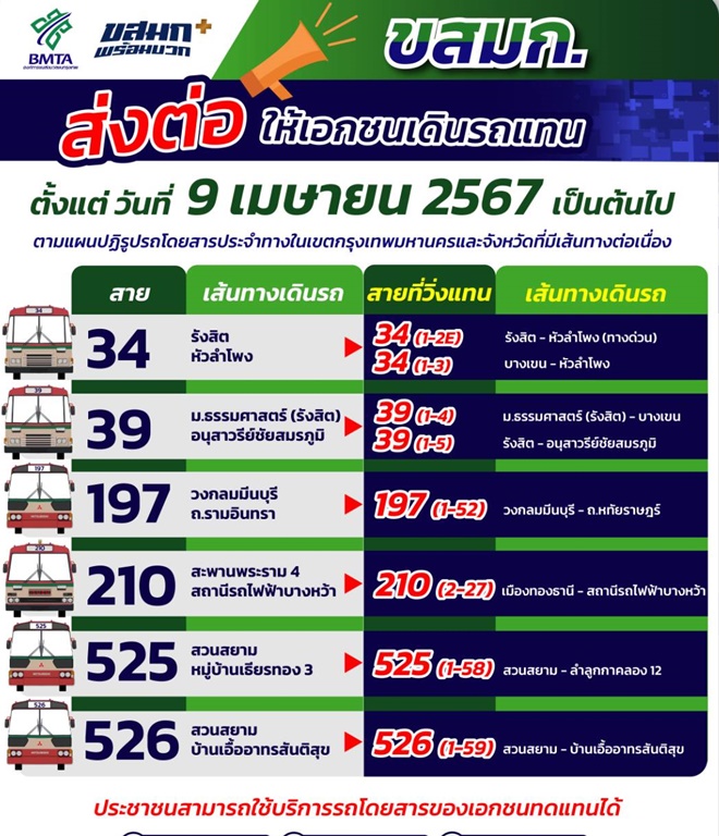 ด้วยความเป็นห่วงพี่น้องประชาชน  ขสมก. จึงยังให้บริการรถโดยสาร สาย 34, 39, 167, 210, 525 และ 526  ซึ่งมีเส้นทางใกล้เคียงกับเส้นทางรถโดยสารของบริษัท  เพื่อไม่ให้เกิดปัญหาในช่วงเปลี่ยนผ่าน ระหว่างการเตรียมดำเนินงานของผู้รับสัมปทาน เพื่อเป็นการแก้ปัญหารถไม่เพียงพอ กับความต้องการใช้บริการของประชาชนในแต่ละวัน และนับตั้งแต่วันที่ 9 เม.ย. 2567 เป็นต้นไป ผู้ได้รับสัมปทานจะสามารถดำเนินการเดินรถเต็มรูปแบบ ดังนั้น ขสมก. จึงเห็นสมควรมอบเส้นทางให้เอกชนดำเนินการเดินรถตามที่ได้รับสัมปทาน และส่งต่อการให้บริการรถโดยสาร ขสมก. สาย 34, 39, 167, 210, 525 และ 526 นับตั้งแต่วันที่ 9 เม.ย. 2567 เป็นต้นไป