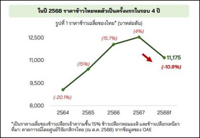 ปี 2568 เป็นปีที่ราคาข้าวไทยหดตัวครั้งแรกในรอบ 4 ปี จากแรงกดดันด้านผลผลิตที่พุ่งสูงและอินเดียเร่งยอดส่งออกข้าว