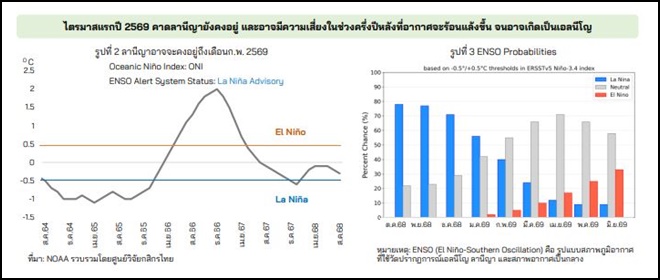 สภาพอากาศที่ยังเอื้อต่อการผลิตของปรากฏการณ์ลานีญาที่คงมีอยู่ในช่วงไตรมาสแรกของปี 2569 (รูปที่ 2-3) จะช่วยหนุนผลผลิตข้าวไทยให้เพิ่มขึ้น โดยเฉพาะในฤดูข้าวนาปรังที่จะมีผลผลิตออกสู่ตลาดราว 41.8% ของผลผลิตข้าวนาปรังทั้งหมด จะส่งผลให้ราคาข้าวปรับลดลง