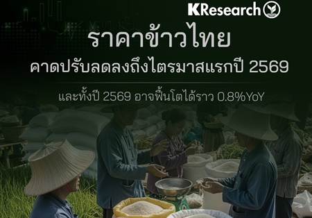 ทั้งปี 2569 คาดว่าราคาข้าวไทยอาจฟื้นขึ้นได้เล็กน้อยราว 0.8% เป็นไปตามราคาข้าวโลกที่เผชิญอุปสงค์ส่วนเกิน เนื่องจากผลผลิตข้าวอาจได้รับผลกระทบจากสภาพอากาศที่ร้อนแล้งขึ้นในช่วงครึ่งปีหลัง