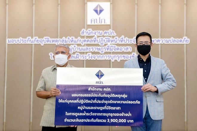 อีกทั้ง ที่ผ่านมา พบว่า เหล่าผู้ปฏิบัติหน้าที่และอาสาสมัครรักษาความปลอดภัยหมู่บ้านและการดูแลเฝ้าระวังจากการบุกรุกของช้างป่าได้รับบาดเจ็บจากช้างป่าทำร้ายร่างกายอยู่บ่อยครั้ง โดยที่ผู้ปฏิบัติหน้าที่และอาสาสมัครเหล่านั้นไม่ได้เป็นข้าราชการหรือเจ้าหน้าที่ของรัฐ และไม่มีสวัสดิการรองรับที่เพียงพอกับความเสี่ยงภัยที่เกิดขึ้น จึงได้สนับสนุนการประกันภัยให้แก่บุคคลผู้ปฏิบัติหน้าที่ เพื่อเป็นการแบ่งเบาภาระครอบครัวและรองรับความเสี่ยงภัยที่อาจเกิดขึ้นต่อชีวิต และร่างกาย โดยมอบ “กรมธรรม์ประกันภัยอุบัติเหตุกลุ่มอาสาเฝ้าระวังช้างป่า” ให้กับผู้ปฏิบัติหน้าที่และอาสาสมัคร จำนวน 39 ราย ซึ่งมีระยะเวลาเอาประกันภัยขณะเข้าปฏิบัติหน้าที่ในการรักษาความปลอดภัยหมู่บ้านและการดูแลเฝ้าระวังจากการบุกรุกของช้างป่า ตั้งแต่วันที่ 2 พฤศจิกายน 2564 ถึงวันที่ 2 พฤศจิกายน 2565 ด้วยเบี้ยประกันภัย 603 บาทต่อราย ให้ความคุ้มครองใน 2 กรณีหลัก ได้แก่ กรณีการเสียชีวิต การสูญเสียอวัยวะ สายตา หรือทุพพลภาพถาวรสิ้นเชิง เนื่องจากอุบัติเหตุทั่วไปขณะเข้าปฏิบัติภารกิจ รวมถึงอุบัติเหตุขณะขับขี่หรือโดยสารรถจักรยานยนต์ และการถูกฆาตกรรมหรือลอบทำร้ายร่างกาย ให้ความคุ้มครองเป็นจำนวนเงินเอาประกันภัย 100,000 บาท และกรณีค่ารักษาพยาบาลจากอุบัติเหตุแต่ละครั้ง ให้ความคุ้มครองเป็นจำนวนเงินเอาประกันภัย 10,000 บาท โดยสำนักงาน คปภ. สนับสนุนด้วยเงินสวัสดิการของสำนักงานฯ เป็นค่าเบี้ยประกันภัยจำนวน 23,517 บาท และบริษัท วิริยะประกันภัย จำกัด (มหาชน) เป็นผู้รับประกันภัย