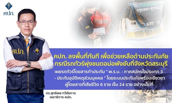 คปภ. ลงพื้นที่ทันที เพื่อช่วยเหลือด้านประกันภัยกรณีรถทัวร์พุ่งชนตอม่อพังยับที่สระบุรี