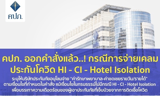 คปภ. ออกคำสั่งแล้ว..! กรณีการจ่ายเคลมประกันโควิด HI – CI – Hotel Isolation ให้บริษัทประกันอนุโลมจ่าย “ค่ารักษาพยาบาล-ค่าชดเชยรายวัน/รายได้”
