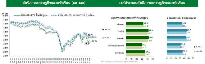โดยสรุปแล้ว ดัชนีภาวะเศรษฐกิจและการครองชีพของครัวเรือนไทย (KR-ECI) ในระดับปัจจุบัน (พ.ค.64) และ 3 เดือนข้างหน้ายังบ่งชี้ถึงความกังวลของครัวเรือนต่อรายได้และการจ้างงาน ระดับเงินออมที่มีแนวโน้มลดลงจะส่งผลต่อการใช้จ่ายและกำลังซื้อในระยะข้างหน้า “วัคซีน” จะเข้ามาเป็นตัวแปรสำคัญให้สถานการณ์กลับมาดีขึ้น ทั้งนี้ ในช่วงรอยต่อระหว่างที่สถานการณ์ยังไม่สิ้นสุด มาตรการกระตุ้นเศรษฐกิจจากภาครัฐจึงยังมีความจำเป็นที่จะเข้ามาช่วยประคับประคองภาคธุรกิจและครัวเรือน