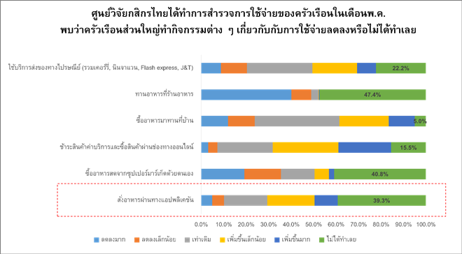 ศูนย์วิจัยกสิกรไทยได้สอบถามเพิ่มเติมเกี่ยวกับการใช้จ่ายของครัวเรือน พบว่าครัวเรือนส่วนใหญ่ทำกิจกรรมต่าง ๆ ที่เกี่ยวกับการใช้จ่ายลดลงหรือไม่ทำเลยเมื่อเทียบกับการระบาดของโควิด-19 ในครั้งก่อน ๆ โดยเฉพาะการทานอาหารที่ร้าน การซื้ออาหารสดจากซุปเปอร์มาร์เกตด้วยตนเอง รวมถึงการสั่งอาหารออนไลน์ ซึ่งผลสำรวจดังกล่าวสอดคล้องไปกับการเปิดเผยข้อมูลของแอปพลิเคชั่นส่งอาหารออนไลน์เจ้าหนึ่งที่ระบุว่าพฤติกรรมผู้บริโภคในช่วงการระบาดของโควิด-19 ระลอกสามหันมาสั่งอาหารผ่านแพลตฟอร์มลดลง หลังผู้บริโภคเปลี่ยนเป็นทำอาหารรับประทานเองมากขึ้น เนื่องจากมีค่าใช้จ่ายที่ถูกกว่า สะท้อนว่าผู้บริโภคมีเงินในกระเป๋าน้อยลงกว่าเดิม