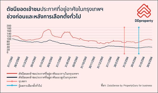 หลังจากการประกาศผลการเลือกตั้งทั่วไปของไทยเมื่อวันที่ 14 พฤษภาคม 2566 ความสนใจในอสังหาริมทรัพย์ได้กลับมาอีกครั้ง โดยมีหลักฐานชี้ชัดว่าดัชนียอดเข้าชมประกาศที่อยู่อาศัยของไทยได้ปรับตัวเพิ่มขึ้นเข้าสู่ระดับสมดุลใหม่ ซึ่งการฟื้นตัวของดีมานด์ในลักษณะนี้สะท้อนให้เห็นถึงความมั่นใจของผู้บริโภคที่มีต่อภาพรวมเศรษฐกิจในระยะยาว เนื่องจากการซื้ออสังหาฯ นั้นถือเป็นการลงทุนระยะยาวกว่าการลงทุนในตลาดหุ้น