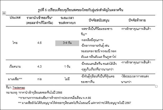 ดังนั้น การรักษาคุณภาพของทุเรียนไทยที่ปัจจุบันยังมีความได้เปรียบอยู่ จากรสชาติที่เป็นที่นิยม และความหลากหลายของพันธุ์ จะเป็นกุญแจสำคัญ ท่ามกลางภาวะที่คู่แข่งจากประเทศเพื่อนบ้าน (รูปที่ 5) และกระทั่งในจีน กำลังเร่งพัฒนาผลผลิตทุเรียน เพื่อรองรับกับความต้องการบริโภคทุเรียนของชาวจีนที่ยังมีอยู่มากและจะยังเพิ่มขึ้นต่อเนื่องในช่วงข้างหน้า