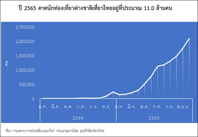 - ศูนย์วิจัยกสิกรไทย ประเมินว่า ทั้งปี 2565 นักท่องเที่ยวต่างชาติเที่ยวไทยน่าจะอยู่ที่ประมาณ 11.0 ล้านคน คิดเป็นสัดส่วนประมาณ 28% ของจำนวนนักท่องเที่ยวต่างชาติเที่ยวไทยในปี 2562 โดยภายหลังจากการเปิดประเทศอย่างเต็มรูปแบบเมื่อเดือน ก.ค. 2565 ที่ผ่านมา ทำให้ชาวต่างชาติให้ความสนใจเดินทางเข้ามาท่องเที่ยวเป็นจำนวนมาก จากการรวบรวมข้อมูลเบื้องต้นคาดว่า ในช่วง 11 เดือนแรกของปี 2565 นักท่องเที่ยวต่างชาติเที่ยวไทยน่าจะมีจำนวนกว่า 9.0 ล้านคน และในเดือน ธ.ค. 2565 หากโควิดไม่ระบาดหนักจนกระทบแผนการเดินทางท่องเที่ยว คาดว่าชาวต่างชาติน่าจะเดินทางเข้ามาเที่ยวในไทยมากขึ้น และมีโอกาสที่จำนวนนักท่องเที่ยวต่างชาติอาจแตะระดับ 2 ล้านคน เป็นครั้งแรกนับแต่มีการระบาดของโควิด เนื่องจากเป็นฤดูกาลท่องเที่ยว และผู้ประกอบการก็เร่งทำการตลาด ขณะที่สายการบินนานาชาติเปิดเส้นทางการบินและเพิ่มความถี่มาไทยมากขึ้นจนถึงช่วงต้นปีหน้า