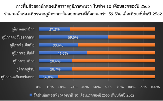นักท่องเที่ยวจากภูมิภาคตะวันออกกลางน่าจะกลับมาฟื้นตัวก่อน และคาดว่าจะเติบโตกว่าปี 2562 โดยตลาดที่สำคัญ คือ นักท่องเที่ยวจากซาอุดีอาระเบีย จากข้อมูลล่าสุดของ กระทรวงการท่องเที่ยวและกีฬา พบว่า ในช่วง 10 เดือนแรกของปี 2565 นักท่องเที่ยวจากภูมิภาคตะวันออกกลางกลับมาแล้วกว่า 59.5% เมื่อเทียบกับในปี 2562 โดยนักท่องเที่ยวหลักมาจากซาอุดีอาระเบีย ซึ่งเติบโตกว่า 186.0% เมื่อเทียบกับปี 2562 และเป็นตลาดเดียวที่เติบโตเป็นบวกเมื่อเทียบกับช่วงก่อนการระบาดของโควิด เนื่องจากได้รับปัจจัยหนุนจากการที่ทางการไทยและซาอุฯได้ปรับความสัมพันธ์ทางการทูตเมื่อต้นปี 2565 ที่ผ่านมา และคาดว่าในปี 2566 นักท่องเที่ยวจากซาอุดีอาระเบียยังคงเติบโตต่อเนื่อง