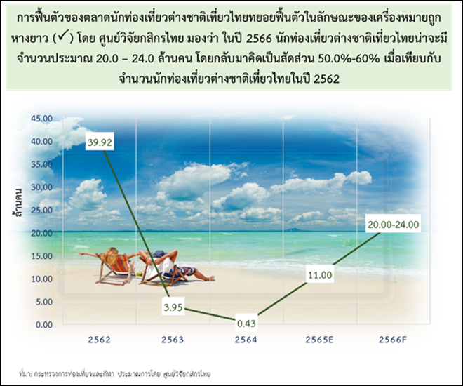 - ภายใต้ปัจจัยดังกล่าว ทำให้การฟื้นตัวของตลาดนักท่องเที่ยวต่างชาติเที่ยวไทยทยอยฟื้นตัวในลักษณะของเครื่องหมายถูกหางยาว () โดย ศูนย์วิจัยกสิกรไทย มองว่า ในปี 2566 นักท่องเที่ยวต่างชาติเที่ยวไทยน่าจะมีจำนวนประมาณ 20.0 – 24.0 ล้านคน โดยกลับมาคิดเป็นสัดส่วน 50.0%-60.0% เมื่อเทียบกับจำนวนนักท่องเที่ยวต่างชาติเที่ยวไทยในปี 2562 (โดยกรอบประมาณการนี้ ประเมินภายใต้สถานการณ์ที่แม้จีนจะเริ่มทยอยผ่อนปรนมาตรการกักตัวและตรวจเชื้อในพื้นที่ต่างๆ แต่ต้องติดตามการระบาดระลอกใหม่ ความก้าวหน้าของการฉีดวัคซีน mRNA และการดำเนินนโยบายช่วงปีหน้า ซึ่งอาจทำให้การกลับมาของนักท่องเที่ยวจีนแบบปกติอาจไม่เกิดขึ้นเร็ว)