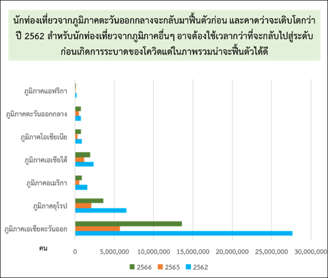 สำหรับนักท่องเที่ยวจากภูมิภาคอื่นอาจต้องใช้เวลากว่าที่จะกลับไปสู่ระดับก่อนเกิดการระบาดของโควิดแต่ในภาพรวมน่าจะฟื้นตัวได้ดี อาทิ นักท่องเที่ยวจากภูมิภาคเอเชียใต้และโอเชียเนียน่าจะฟื้นตัวดี ขณะที่นักท่องเที่ยวจากภูมิภาคเอเชียตะวันออกในภาพรวมจะฟื้นตัวได้ช้ากว่าภูมิภาคอื่นๆ เนื่องจากสัดส่วนของนักท่องเที่ยวจีนที่สูง อย่างไรก็ดี เมื่อพิจารณารายประเทศ พบว่า นักท่องเที่ยวจากมาเลเซีย สิงคโปร์ เกาหลีใต้ และญี่ปุ่น ทยอยฟื้นตัวดีขึ้น