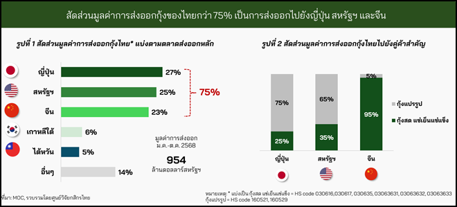 ศูนย์วิจัยกสิกรไทยคาดว่า มูลค่าการส่งออกกุ้งของไทยในปี 2569 จะอยู่ที่ 1,075 ล้านดอลลาร์สหรัฐฯ หดตัว 3.6% เมื่อเทียบกับปีก่อน จากอุปสงค์กุ้งในประเทศคู่ค้าหลักมีทิศทางลดลง ตามภาวะเศรษฐกิจและกำลังซื้อ ผลกระทบจากภาษี Reciprocal Tariffs ที่ชัดเจนมากขึ้นเต็มปี รวมถึงเผชิญการแข่งขันรุนแรงกับคู่แข่งสำคัญ โดยเฉพาะเอกวาดอร์ และอินโดนีเซีย