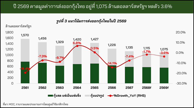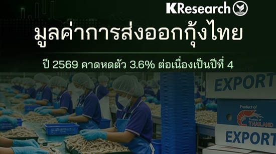 ปี 2569 คาดมูลค่าการส่งออกกุ้งของไทยยังหดตัวต่อเนื่องเป็นปีที่ 4 จากความต้องการในตลาดโลกที่อ่อนแอ และเผชิญการแข่งขันรุนแรง