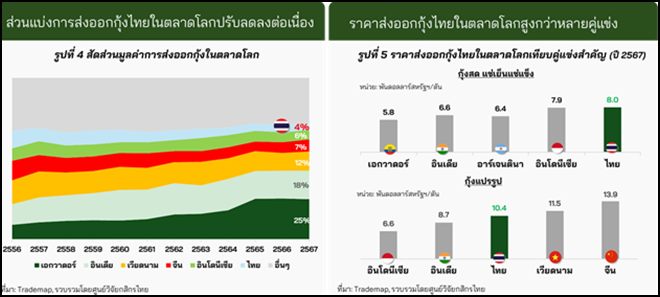 แนวโน้มการส่งออกกุ้งของไทย ยังเผชิญปัญหาความสามารถในการแข่งขัน จากทั้งปริมาณผลผลิตที่ปรับเพิ่มได้ยาก ต้นทุนการผลิตที่สูงกว่าคู่แข่ง รวมถึงการแข่งขันด้านราคาที่เข้มข้นขึ้นจากสงครามการค้า