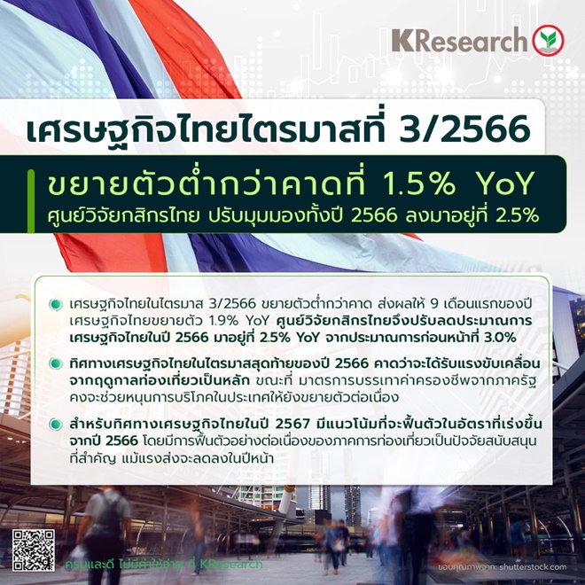 ขณะที่ เมื่อมองไปในระยะข้างหน้า ศูนย์วิจัยกสิกรไทยมองว่า กนง. มีแนวโน้มคงดอกเบี้ยนโยบายที่ระดับ 2.50% ไปตลอดทั้งปี 2567 หากเศรษฐกิจไทยในปีหน้าฟื้นตัวต่อเนื่องและขยายตัวได้ไม่ต่ำกว่าปี 2566 โดยทิศทางเศรษฐกิจไทยในปี 2567 มีการฟื้นตัวอย่างต่อเนื่องของภาคการท่องเที่ยวเป็นปัจจัยสนับสนุนที่สำคัญ นอกจากนี้ ภาคการส่งออกของไทยในปีหน้าก็คาดว่าจะกลับมาเติบโตได้ในแดนบวก โดยส่วนหนึ่งเป็นผลมาจากปัจจัยฐาน อีกทั้ง มาตรการกระตุ้นเศรษฐกิจจากภาครัฐซึ่งคาดว่าจะมีผลบังคับใช้ในปี 2567 ก็คงจะเป็นปัจจัยสำคัญที่จะช่วยหนุนการบริโภคภายในประเทศให้ยังขยายตัวได้