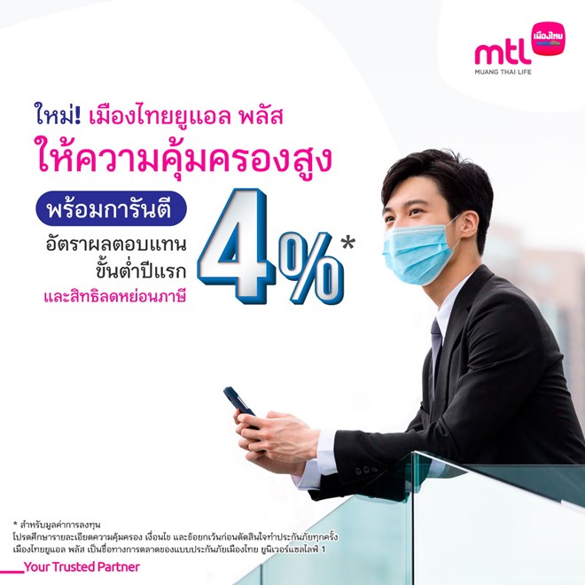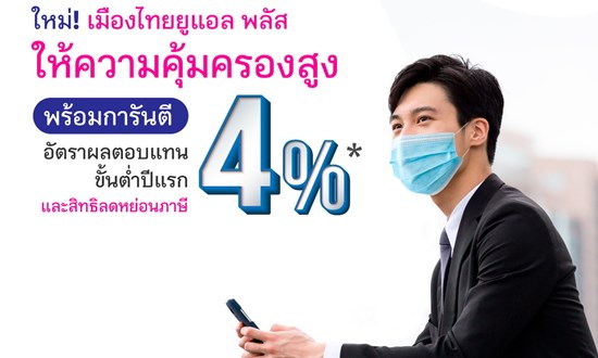 เมืองไทยประกันชีวิตเพิ่มทางเลือกใหม่ในการวางแผนความมั่นคงในชีวิตและการเงินด้วยโครงการเมืองไทย ยูแอล พลัส ให้ลูกค้าได้สร้างแผนการเงินระยะยาวเพื่อส่งต่อความมั่นคงให้คนข้างหลัง มอบความคุ้มครองสูง การันตีอัตราผลตอบแทนขั้นต่ำปีแรก 4% ของเงินลงทุน