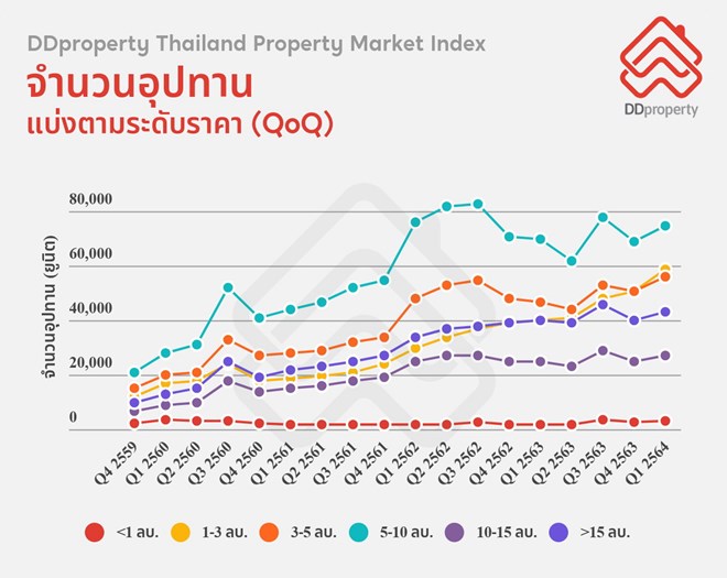 เมื่อพิจารณาจากรายงานจะพบว่า จำนวนอุปทานที่เพิ่มขึ้นมากที่สุดจะเป็นระดับราคา 1-3 ล้านบาท เพิ่มขึ้นถึง 14% จากไตรมาสก่อน รองลงมาคือราคา 3-5 ล้านบาท และระดับราคา 5-10 ล้านบาท (เพิ่มขึ้น 10% และ 8% ตามลำดับ) สะท้อนให้เห็นว่า ผู้บริโภคระดับกลาง-ล่างยังคงไม่มีกำลังซื้อเพียงพอ จึงต้องเลือกใช้จ่ายในสิ่งที่จำเป็นที่สุดก่อน สอดคล้องกับผลสำรวจ “ครอบครัวไทยในยุคโควิด-19” ของสวนดุสิตโพล มหาวิทยาลัยสวนดุสิต ที่พบว่า ผู้บริโภคส่วนใหญ่ถึง 75.41% มองว่าปัญหาหนี้สิน เป็นปัญหาในครอบครัวที่พบมากขึ้นในยุคโควิด-19 นี้ และปัญหาหนักอกในครอบครัวอันดับแรกยังคงเป็นเรื่องรายได้และค่าใช้จ่ายถึง 44.27% ในขณะที่ผู้บริโภคในระดับบนแม้จะยังคงให้ความสนใจในการซื้อหรือลงทุนในตลาดอสังหาฯ แต่จากความไม่แน่นอนของสถานการณ์ปัจจุบัน รวมทั้งไม่มีมาตรการกระตุ้นอสังหาฯ สำหรับที่อยู่อาศัยในระดับราคาอื่น จึงส่งผลให้ผู้บริโภคกลุ่มนี้มีแนวโน้มที่จะใช้เวลาในการตัดสินใจซื้อที่อยู่อาศัยนานขึ้นหรือชะลอการซื้อออกไปก่อนเช่นกัน