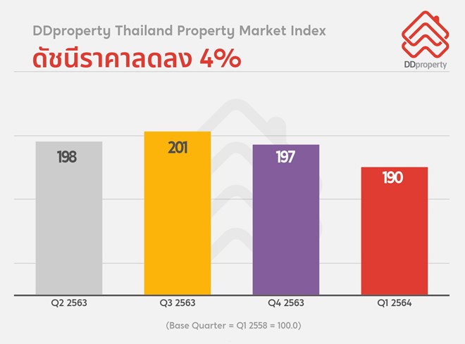ข้อมูลล่าสุดจากรายงาน DDproperty Thailand Property Market Index เผยดัชนีราคาที่อยู่อาศัยในกรุงเทพฯ ปรับตัวลดลงมาอยู่ที่ 190 จุด จาก 197 จุด หรือลดลง 4% จากไตรมาสก่อน ถือเป็นดัชนีราคาที่ต่ำที่สุดในรอบ 15 ไตรมาส (นับตั้งแต่ไตรมาสที่ 2 ปี 2560) แม้เคยคาดการณ์ว่าตลาดอสังหาฯ จะมีแนวโน้มฟื้นตัวได้ในปีนี้ แต่จากสถานการณ์การแพร่ระบาดฯ อย่างต่อเนื่องในช่วงครึ่งปีแรก ทำให้มีความเป็นไปได้ยาก คาดว่าตลาดจะมีทิศทางเติบโตอีกครั้งเมื่อภาครัฐสามารถควบคุมการแพร่ระบาดฯ ได้ และมีการฉีดวัคซีนมากเพียงพอที่จะสร้างภูมิคุ้มกันหมู่ในประเทศ