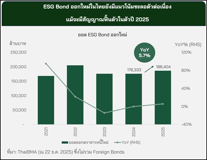 การออก ESG Bond ใหม่ในประเทศไทย เริ่มมีสัญญาณฟื้นตัวในปี 2025 หลังตลาดชะลอตัวมาหลายปี โดยมียอดตราสารหนี้ออกใหม่อยู่ที่ 186,404 ล้านบาท (ณ 22 ธ.ค. 2025) เพิ่มขึ้นจากปีก่อน 5.7% ซึ่งอยู่ที่ 176,333 ล้านบาท