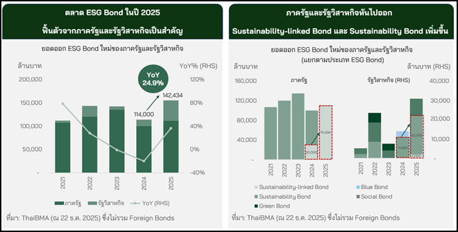 ภาครัฐและรัฐวิสาหกิจปรับทิศทางมาออก Sustainability-linked Bond และ Sustainability Bond เพิ่มขึ้น กลายเป็นแรงส่งสำคัญที่ทำให้ตลาด ESG Bond ในปี 2025 ฟื้นตัว ด้วยยอดออกใหม่รวมกันกว่า 142,434 ล้านบาท (ณ 22 ธ.ค. 2025) เพิ่มขึ้นจากปีก่อน 24.9% ซึ่งอยู่ที่ 114,000 ล้านบาท