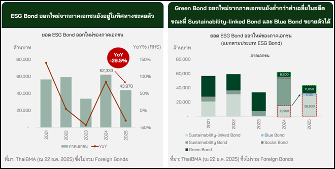 การออก ESG Bond ใหม่จากภาคเอกชนยังคงอยู่ในภาวะชะลอตัว ในปี 2025 ภาคเอกชนมียอดออก ESG Bond ใหม่อยู่ที่ 43,970 ล้านบาท (ณ 22 ธ.ค. 2025) ลดลงจากปีก่อนถึง 29.5% ซึ่งอยู่ที่ 62,333 ล้านบาท จากการหดตัวของยอดออก Sustainability Bond และ Social Bond