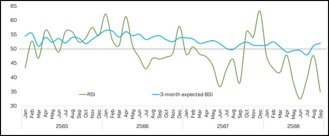 - กำลังซื้อของผู้บริโภคยังไม่ฟื้นตัว สะท้อนจากดัชนีความเชื่อมั่นผู้ประกอบการค้าปลีก (RSI) เดือนกันยายน ยังคงอยู่ที่ระดับต่ำกว่า 50 ต่อเนื่องติดต่อกันเป็นเดือนที่ 9 ของปีนี้ ขณะที่ดัชนีความเชื่อมั่นธุรกิจในอีก 3 เดือนข้างหน้า (BSI) แม้ว่าจะขยับขึ้นมาเกินที่ระดับ 50 เพียงเล็กน้อย แต่ก็ยังถือว่าต่ำกว่าปีก่อน (รูปที่ 3) บ่งชี้ถึงความไม่เชื่อมั่นทางด้านเศรษฐกิจและกำลังซื้อของผู้บริโภคที่ยังมีอยู่