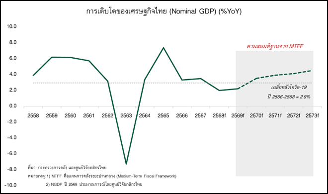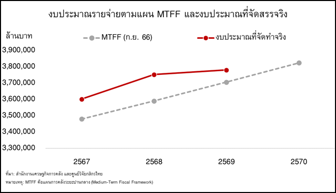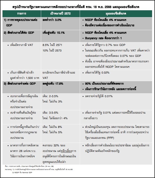 เมื่อวันที่ 18 พฤศจิกายน 2568 คณะรัฐมนตรีได้มีมติเห็นชอบแผนการคลังระยะปานกลาง (Medium-Term Fiscal Framework: MTFF) ประจำปีงบประมาณ 2570–2573 เพื่อมุ่งลดระดับการขาดดุลงบประมาณสู่ 3.0% ของ nominal GDP ภายในปี 2572