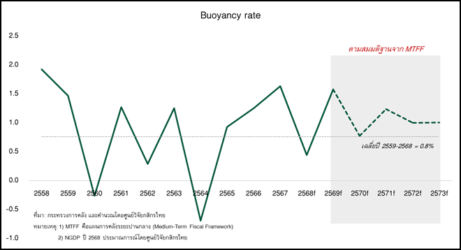• ประสิทธิภาพการจัดเก็บรายได้ต้องขยายตัวเร็วกว่าการเติบโตทางเศรษฐกิจ หรือ Buoyancy rate มีค่ามากกว่า 1 ซึ่งในช่วง 10 ปีที่ผ่านมา (2558-2567) มีค่าเฉลี่ยอยู่ที่ 0.8 สะท้อนการจัดเก็บรายได้รัฐบาลเติบโตช้ากว่าเศรษฐกิจ กล่าวคือ เมื่อเศรษฐกิจเติบโตได้ 1% รัฐบาลเพิ่มรายได้ ได้เพียง 0.8% (รูปที่ 2)