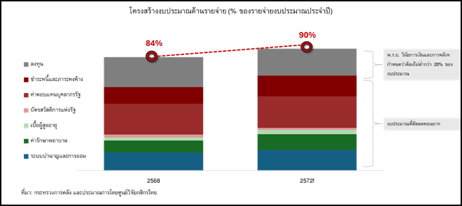 • การปรับลดงบประมาณด้านรายจ่ายมีข้อจำกัดค่อนข้างมาก เนื่องจากกว่า 90% เป็นรายจ่ายประจำที่ปรับลดยาก ได้แก่ รายจ่ายสวัสดิการ ค่าจ้างบุคลากรภาครัฐ หนี้และภาระคงค้าง และรายจ่ายลงทุนยังถูกกำหนดให้ต้องจัดสรรไม่ต่ำกว่า 20% ของงบประมาณรายจ่ายประจำปี (รูปที่ 3) ส่งผลให้พื้นที่สำหรับการปรับลดในระยะสั้นมีจำกัด นอกจากจะมีการปฏิรูปรายจ่ายเชิงโครงสร้างหรือปรับลดงบประมาณในหมวดที่มีขนาดใหญ่