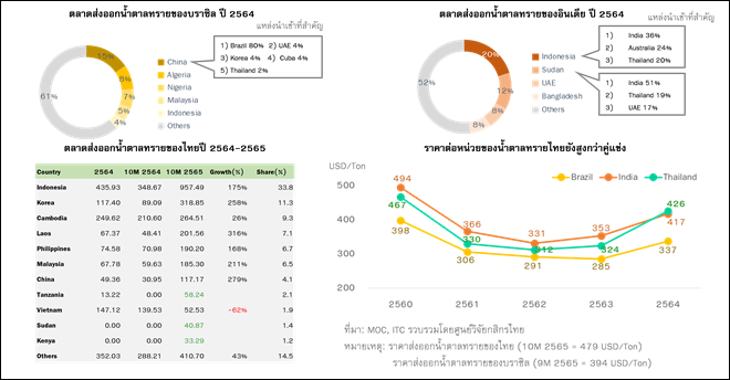 ขณะที่ภาพรวมการส่งออกน้ำตาลทรายของไทย ก็พบว่า มีตลาดคู่ค้าใหม่หลายประเทศที่มีความต้องการนำเข้าน้ำตาลทรายจากไทยมากขึ้น เพื่อสร้างความมั่นคงทางอาหารในประเทศ อาทิ จีน แทนซาเนีย เคนยา เป็นต้น อย่างไรก็ตาม ภาพรวมของการส่งออกน้ำตาลทรายของไทยยังเผชิญกับการแข่งขันด้านราคา โดยเฉพาะกับคู่แข่งสำคัญอย่าง บราซิล ซึ่งมีส่วนแบ่งการส่งออกราว 21% ของการส่งออกน้ำตาลทรายทั้งหมดของโลก (ผู้ส่งออกน้ำตาลทรายอันดับ 1 ของโลก) ขณะที่การย่อตัวของราคาส่งออกน้ำตาลทรายไทยในปี 2566 น่าจะอยู่ในกรอบที่จำกัด จากต้นทุนการผลิตที่ขยับสูงขึ้น ไม่ว่าจะเป็นค่าปุ๋ยและสารเคมี ค่าแรงงาน ค่าพลังงานและขนส่ง ฯลฯ จึงทำให้น้ำตาลทรายส่งออกจากไทยค่อนข้างเสียเปรียบคู่แข่ง โดยเฉพาะบราซิล ซึ่งมีราคาต่อหน่วยอยู่ในระดับที่ต่ำกว่า อีกทั้งยังพยายามที่จะขยายตลาดน้ำตาลทรายในฝั่งเอเชียให้ได้เพิ่มขึ้น โดยเฉพาะในตลาดอินโดนีเซีย มาเลเซีย (คู่ค้ารายสำคัญของไทย) รวมถึงจีน ซึ่งเป็นคู่ค้ารายใหม่ที่ไทยกำลังเข้าไปทำตลาดด้วย
