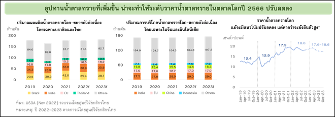 1) ปริมาณผลผลิตน้ำตาลทรายในตลาดโลกที่เพิ่มขึ้น อาจส่งผลให้ระดับราคาน้ำตาลทรายโลกปรับลดลงจากปี 2565: ผลผลิตน้ำตาลโลกปี 2565/2566 มีแนวโน้มขยับขึ้น โดยเฉพาะจากบราซิล ไทยและจีน จากผลผลิตอ้อยที่สูงจากสภาพอากาศที่เอื้ออำนวย ซึ่งน่าจะชดเชยผลผลิตที่ลดลงของอินเดียและอียูได้ ส่งผลให้ระดับราคาน้ำตาลทรายล่วงหน้าในตลาดโลกปี 2566 อาจเฉลี่ยอยู่ที่ 17.6-18.6 เซนต์ต่อปอนด์ ปรับลดลงเล็กน้อยจากปี 2565 ที่คาดว่าจะอยู่ที่ 18.6 เซนต์ต่อปอนด์ จึงคาดว่าราคาส่งออกน้ำตาลทรายของไทยในปี 2566 น่าจะมีทิศทางปรับย่อลงและสอดรับไปกับราคาน้ำตาลทรายในตลาดโลก