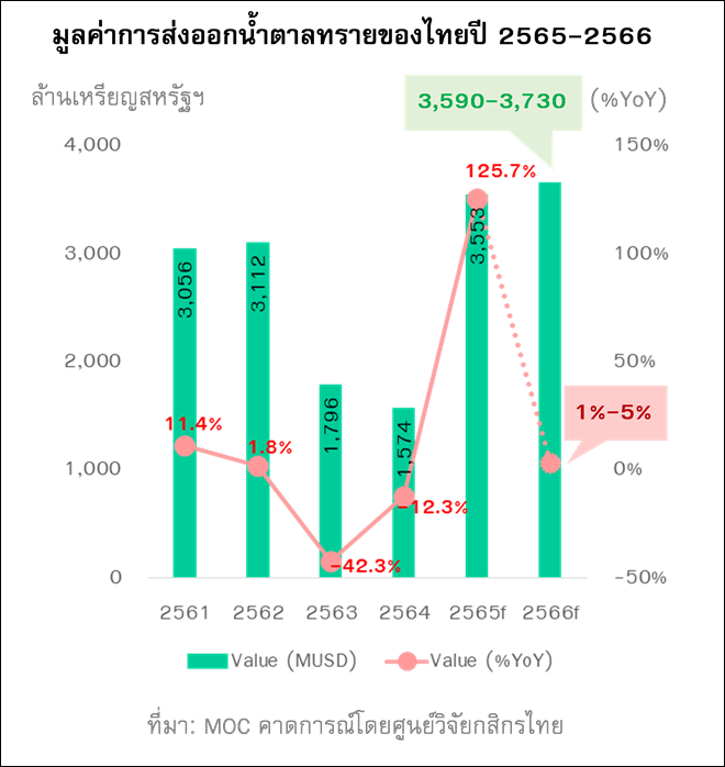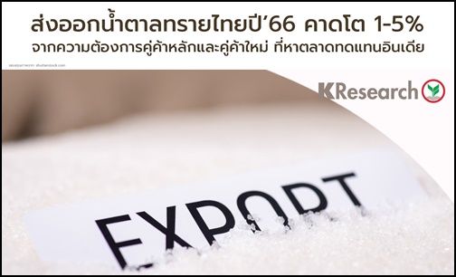 - ศูนย์วิจัยกสิกรไทย คาดว่า มูลค่าการส่งออกน้ำตาลทรายไทยปี 2566 อาจอยู่ที่ระดับ 3,590-3,730 ล้านเหรียญสหรัฐฯ ขยายตัว 1-5% เมื่อเทียบกับปี 2565 ที่คาดว่าจะเติบโตสูงถึง 125% โดยในปี 2566 การเติบโตเป็นผลจากปริมาณเป็นหลัก (Q) จากปริมาณส่งออกคาดว่าจะเพิ่มขึ้นในตลาดคู่ค้าหลักที่มีความต้องการต่อเนื่อง และอานิสงส์จากคู่ค้าใหม่ที่หาตลาดทดแทนจากมาตรการจำกัดการส่งออกน้ำตาลทรายของอินเดีย ขณะที่การเติบโตจากฝั่งราคา (P) อาจปรับลดลงตามทิศทางราคาน้ำตาลในตลาดโลก
