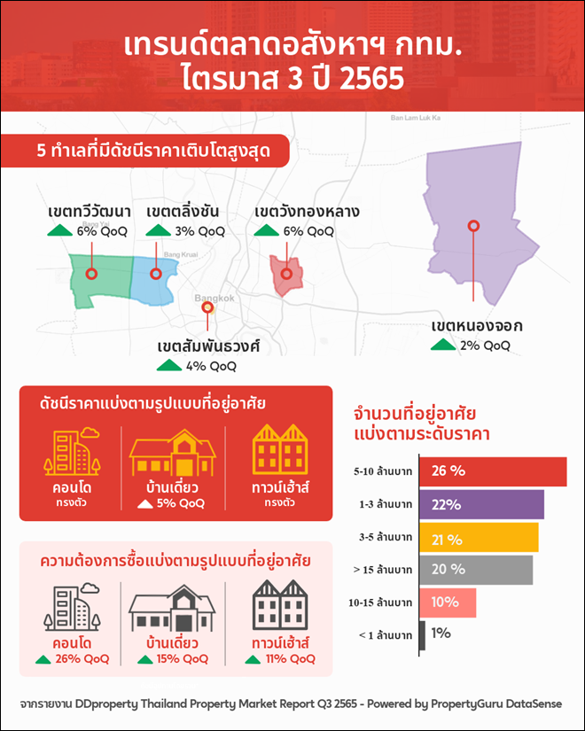 รายงาน DDproperty Thailand Property Market Report Q3 2565 – Powered by PropertyGuru DataSense ซึ่งวิเคราะห์จากข้อมูลประกาศขาย-เช่าอสังหาฯ บน DDproperty เผยข้อมูลเชิงลึกของตลาดอสังหาฯ ไทยในไตรมาสล่าสุด สรุปภาพรวมความต้องการที่อยู่อาศัยที่น่าสนใจทั้งในตลาดซื้อและตลาดเช่า พร้อมอัปเดตทำเลศักยภาพที่มีแนวโน้มราคาเติบโตในไตรมาสนี้