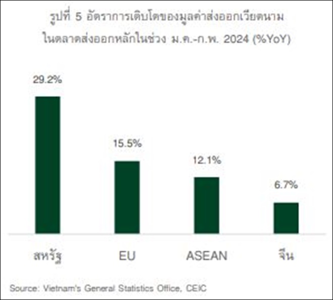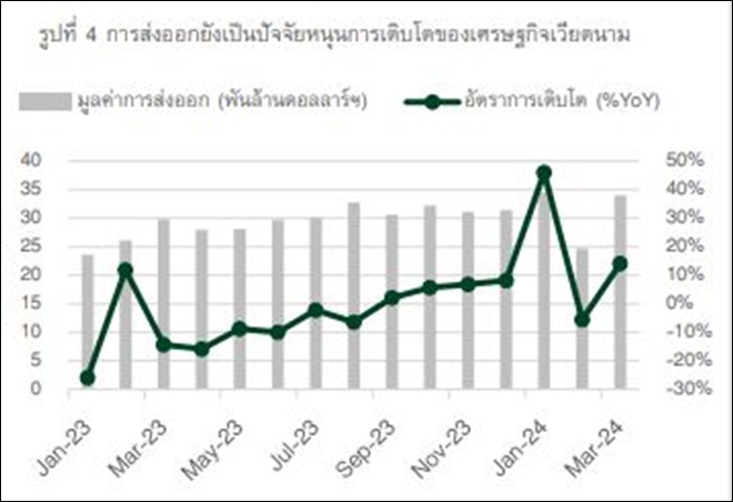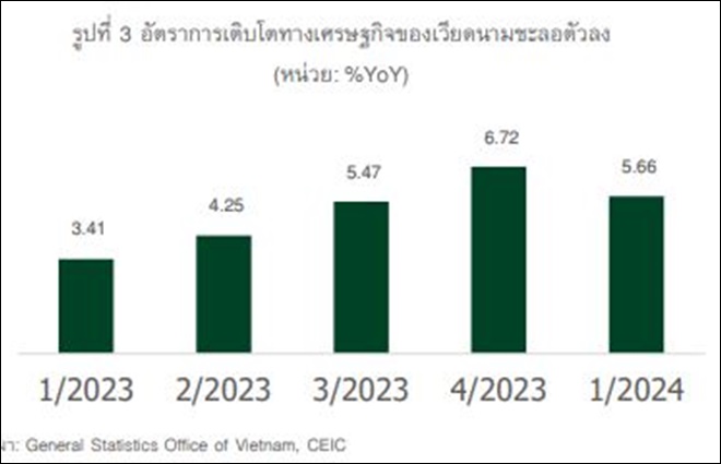 - ศูนย์วิจัยกสิกรไทยมองว่าทั้งปี 2567 เศรษฐกิจเวียดนามมีแนวโน้มเติบโตอยู่ที่ 5.8-6.0% จากแรงหนุนของการส่งออก เศรษฐกิจเวียดนามในไตรมาส 1/2567 เติบโตชะลอตัวมาอยู่ที่ระดับ 5.66%YoY จากการชะลอตัวของการลงทุนในภาพรวม โดยการลงทุนภาครัฐที่ชะลอตัวส่วนหนึ่งเป็นผลจากกระแสการปราบปรามการคอร์รัปชันในเวียดนามที่ทำให้การอนุมัติโครงการและการเบิกจ่ายงบประมาณลงทุนภาครัฐเกิดความล่าช้า อย่างไรก็ตาม การส่งออกยังเป็นปัจจัยหนุนการเติบโตเศรษฐกิจของเวียดนามในไตรมาสที่ 1/2567 โดยมูลค่าการส่งออกเติบโตเร่งขึ้นมาอยู่ที่ระดับ 17.2%YoY โดยการส่งออกที่เพิ่มขึ้นส่วนใหญ่มาจากสินค้าอิเล็กทรอนิกส์และคอมพิวเตอร์ (30.4%YoY) ส่วนผลกระทบของวิกฤตทะเลแดงต่อการส่งออกไปยังยุโรปยังมีค่อนข้างจำกัด เห็นได้จากมูลค่าการส่งออกไปยัง EU ที่ยังเพิ่มขึ้นถึง 15.5%YoY ในช่วงเดือน ม.ค.-ก.พ. ศูนย์วิจัยกสิกรไทยมองว่าการส่งออกจะเป็นปัจจัยหนุนหลักในการเติบโตของเศรษฐกิจเวียดนามในช่วงที่เหลือของปี อันเป็นผลจากความต้องการสินค้าอิเล็กทรอนิกส์ของโลกที่เพิ่มขึ้นและฐานการส่งออกที่ต่ำในปีก่อน อย่างไรก็ตาม สถาบันการเงินก็เพิ่มความระมัดระวังในการปล่อยสินเชื่อมากขึ้นเนื่องจากสัดส่วน NPL ที่เพิ่มขึ้น ซึ่งอาจส่งผลให้การบริโภคภาคครัวเรือน โดยเฉพาะอย่างยิ่งการซื้อรถยนต์และที่อยู่อาศัยซึ่งส่วนใหญ่จำเป็นต้องใช้สินเชื่อมีแนวโน้มชะลอตัวลงในปีนี้