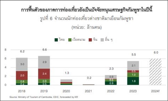 - เศรษฐกิจกัมพูชาคาดเติบโตเร่งขึ้นเล็กน้อยในปี 2567 โดยมีปัจจัยหนุนจากการฟื้นตัวของภาคการท่องเที่ยวและการส่งออก ภาคการท่องเที่ยวกัมพูชาคคาดเติบโตต่อเนื่องตลอดทั้งปี และคาดว่าจะมีจำนวนนักท่องเที่ยวต่างชาติเพิ่มขึ้นแตะระดับ 6 ล้านคนในปีนี้ โดยในเดือนม.ค.-ก.พ.2567 นักท่องเที่ยวต่างชาติเดินทางเข้ามาเพิ่มขึ้น 18.0%YoY อยู่ที่ 988,574 คน ซึ่งนักท่องเที่ยวส่วนใหญ่มาจากประเทศไทย (247,530 คน) เวียดนาม (185,385 คน) และจีน (109,990 คน) ทั้งนี้ นักท่องเที่ยวต่างชาติคิดเป็น 18.2% ของ GDP กัมพูชาในช่วงก่อนเกิดโควิด 19 (ปี 2562) นอกจากนี้ การส่งออกของกัมพูชาก็ฟื้นตัวขึ้นจากสถานการณ์การส่งออกโลกที่ดีขึ้นและฐานที่ต่ำ โดยในเดือนม.ค.-ก.พ.67 การส่งออกของกัมพูชาขยายตัวอยู่ที่ 22.7%YoY ซึ่งการส่งออกที่เพิ่มขึ้นส่วนใหญ่มาจากสินค้ากลุ่มเสื้อผ้าและเครื่องนุ่งห่ม (26.4%YoY) ข้าว (40.3%YoY) และผักผลไม้ (53.8% YoY) ทั้งนี้ การส่งออกเป็นปัจจัยหนุนสำคัญของเศรษฐกิจกัมพูชาคิดเป็นสัดส่วน 76% ของ GDP ศูนย์วิจัยกสิกรไทยคาดว่า การฟื้นตัวของภาคการท่องเที่ยวและการส่งออกจะช่วยหนุนให้เศรษฐกิจกัมพูชาเติบโตได้อยู่ที่ 5.8% ในปี 2567