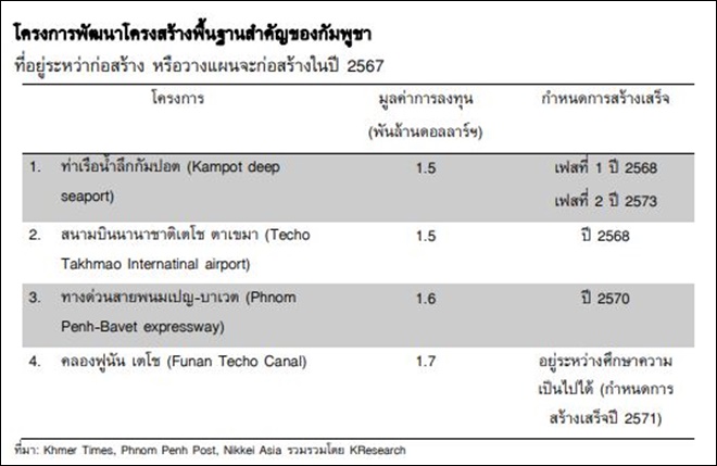 - โครงสร้างพื้นฐานจะช่วยหนุนการเติบโตของเศรษฐกิจกัมพูชาได้ในระยะกลาง โดยรัฐบาลกัมพูชามีแผนพัฒนาโครงสร้างพื้นฐานภายในปี 2573 ซึ่งส่วนใหญ่เป็นโครงการภายใต้ความร่วมมือของภาครัฐและภาคเอกชน (PPP) โดยเฉพาะกับบริษัทจีน รัฐบาลกัมพูชาวางแผนจะสร้างโครงสร้างพื้นฐานรวม 16 พันล้านดอลลาร์สหรัฐฯ ภายใน 6 ปีข้างหน้า ซึ่งหลายโครงการได้เริ่มการก่อสร้างแล้ว ดังนั้น โครงการลงทุนเหล่านี้จะช่วยเพิ่มการลงทุนภาครัฐ รวมทั้งส่งเสริมการขยายตัวของเม็ดเงิน FDI ในระยะข้างหน้า