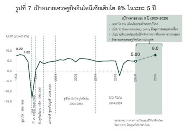 - นโยบายเศรษฐกิจของว่าที่ผู้นำคนใหม่ที่เปิดเผยออกมา มีเป้าหมายขับเคลื่อนเศรษฐกิจเติบโต 8% ในระยะ 5 ปี สูงสุดในรอบเกือบ 3 ทศวรรษ (รูปที่ 7 ) ซึ่งในรายละเอียดของนโยบายยังคงเดินหน้าแผนงานเดิมในการย้ายเมืองหลวงตามกำหนดเดิม นโยบายการห้ามส่งออกแร่ดิบเพื่อให้เกิดการลงทุนในอุตสาหกรรมกลางน้ำและปลายน้ำในประเทศ รวมถึงแผนงานใหม่ที่ให้ความสำคัญกับการยกระดับคุณภาพชีวิตของประชาชนด้วยการจัดสรรงบประมาณขนาดใหญ่ นโยบายสิ่งแวดล้อมที่สอดคล้องกับกระแสโลก รวมถึงนโยบายด้านต่างประเทศที่ยังคงคำนึงถึงผลประโยชน์ของประเทศ