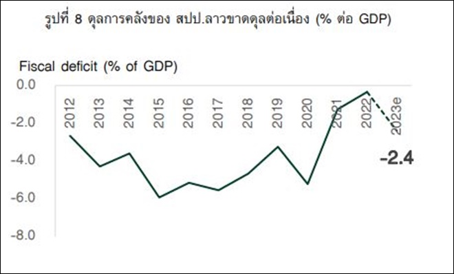 - ศูนย์วิจัยกสิกรไทย มองว่า การปรับขึ้นภาษีดังกล่าวเป็นหนึ่งในแผนงานเพื่อปรับปรุงฐานะการคลังของประเทศ ท่ามกลางการขาดดุลการคลังของ สปป. ลาวอย่างต่อเนื่อง (รูปที่ 8) ในขณะที่ระดับหนี้สาธารณะ ณ สิ้นปี 2566 อยู่ที่ 18.7 พันล้านดอลลาร์สหรัฐฯ หรือคิดเป็น 125% ของ GDP อย่างไรก็ตาม การปรับเพิ่มอัตรา VAT ให้กลับไปสู่ระดับ10% อาจส่งผลกระทบต่อเศรษฐกิจ สปป. ลาว ดังนี้ 1) หากผู้ผลิตผลักภาระภาษีที่เพิ่มขึ้นให้ผู้บริโภคก็จะซ้ำเติมปัญหาเงินเฟ้อที่สูงอยู่แล้ว และ 2) การเก็บภาษีในอัตราเดียวกันทำให้ผู้มีรายได้น้อยซึ่งเป็นคนส่วนใหญ่ในประเทศรับภาระภาษีที่เพิ่มขึ้นมากกว่าคนรายได้สูง ซึ่งอาจจะกระทบการใช้จ่ายเพื่อการบริโภคให้อ่อนแรงลง ทั้งนี้ ท่ามกลางปัญหาเงินเฟ้อที่ยังอยู่ในระดับสูง 25.35% (เดือน ก.พ.2567) อัตราแลกเปลี่ยนที่ยังผันผวนในระดับอ่อนค่าต่อเนื่องอยู่ที่ 19,655 กีบ/ดอลลาร์ฯ (Reference Rate ณ 26 มี.ค.67) ประกอบกับผลกระทบจากการขึ้นภาษี VAT ดังกล่าวเศรษฐกิจสปป.ลาวในปี 2567 อาจจะขยายตัวได้ไม่ถึงเป้าหมายของทางการที่ 4.5%