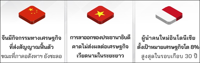 - การลาออกของประธานาธิบดีเวียดนามอาจส่งผลต่อบรรยากาศในการลงทุนในระยะสั้น แต่คาดว่าไม่ส่งผลต่อการเติบโตทางเศรษฐกิจของเวียดนามในระยะยาว กระแสการปราบปรามการคอร์รัปชันในเวียดนามส่งผลให้ประธานาธิบดีหวอ วัน เถืองยื่นใบลาออก หลังดำรงตำแหน่งเพียง 1 ปี และนับเป็นประธานาธิบดีคนที่ 2 ที่ถูกกดดันให้ลาออกในช่วงปีที่ผ่านมา การลาออกของประธานาธิบดีเวียดนามอาจส่งผลให้เกิดความไม่แน่นอนทางการเมืองซึ่งอาจกระทบต่อบรรยากาศในการลงทุน โดยนักลงทุนต่างชาติต้องการรอดูความชัดเจนทางการเมืองจนกว่าจะมีการแต่งตั้งประธานาธิบดีคนใหม่ ส่วนแนวนโยบายเศรษฐกิจ รวมทั้งนโยบายการค้าการลงทุนกับต่างประเทศคาดว่าไม่ได้รับผลกระทบจากการลาออกในครั้งนี้ จึงมองว่าเหตุการณ์นี้จะไม่ส่งผลกระทบต่อปัจจัยพื้นฐานและการเติบโตทางเศรษฐกิจของเวียดนามในระยะยาว