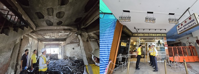 - อาคารตึกแถว 6 ชั้นที่อยู่ด้านนอก และติดกับชุมชนตรอกโพธิ์ ซึ่งทางสมาคมฯ ได้เข้าตรวจสอบอาคารที่เป็นภัตตาคารและโรงแรม พบว่า อาคารทั้งสองเป็นโครงสร้างคอนกรีตเสริมเหล็กซึ่งเป็นวัสดุที่ทนไฟได้ดีกว่าอาคารไม้หรือเหล็ก จากการตรวจสอบชั้น 4-6 ของอาคารยังไม่พบความเสียหายของโครงสร้าง เนื่องจากคอนกรีตไม่เปลี่ยนสี คอนกรีตที่หุ้มเหล็กยังไม่กะเทาะ และเหล็กเสริมที่อยู่ด้านในไม่เสียรูป แสดงว่ายังไม่ได้รับผลกระทบจากความร้อนมากนัก โดยรวมแล้ว สภาพทางโครงสร้างยังถือว่ามั่นคงแข็งแรงอยู่